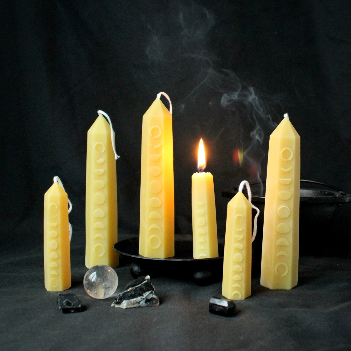 Our obelisk shaped ritual candle is made with 100% raw beeswax and a cotton wick.